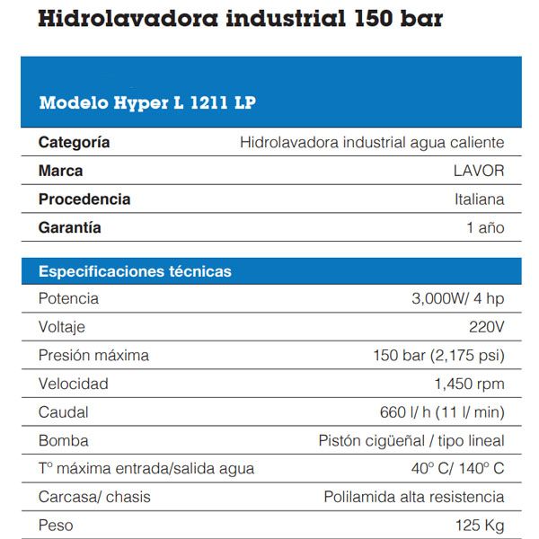 Hidrolavadora agua caliente Industrial 150 Bar / 3.000 W/ 4 Hp Lavor Hyper L 1211