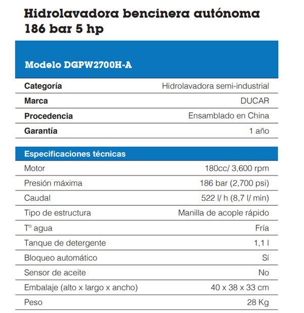 La Hidrolavadora Autonoma de agua fría Dgpw2700 con un motor DUCAR de 5 Hp es un equipo de gran eficacia, fiabilidad seguridad y fácil uso, equipada co bomba axial con 3 pistones de acero, cabezal en aluminio con válvula by-pass incorporada para uso semi industrial que asegura un gran rendimiento incorpora 4 Boquillas (0º, 15º, 40º, para jabon).