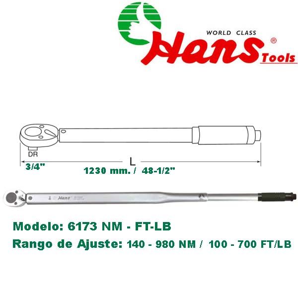 Llave de Torque o Dinamométrica con encastre de 3/4″, de Uso profesional para uso tanto en la industria como en Taller Mecánico y/o mantención Industrial. El principio de funcionamiento de la Llave de Torsión consiste en realizar un Torque (Par de Apriete) o apriete recomendado por fabricante o uso requerido de funcionamiento de la maquinaria. Para el caso particular de Llave torque modelo 6173-2GN de HANS está en rango de 140 a 980 Newton Metro; Esta se regula desde manilla, girando seguro en parte posterior en sentido Anti-Horario para ajustar hasta rango requerido, luego se gira seguro en sentido Horario para bloquear. El mango está moleteado para un buen agarre, y cuando se alcanza el par de torsión requerido, la llave produce un clic audible y una ligera liberación de tensión.
